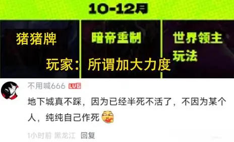 说到游戏内容,实在一言难尽。10月推出 “猪猪牌”,12 月推出暗帝重做与 “世界领主降临”,整个下半年几乎没有可体验的实质性内容。